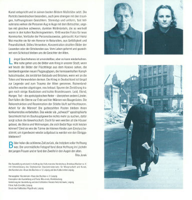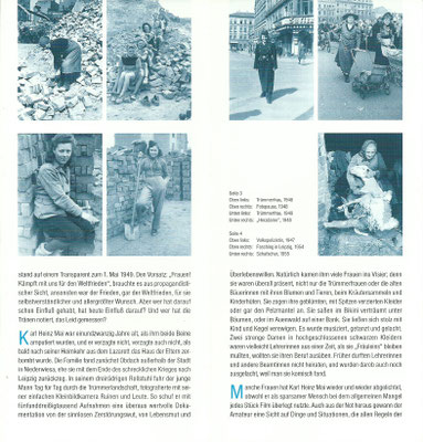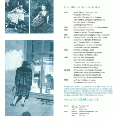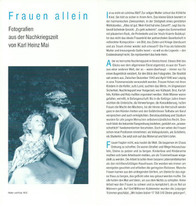Die Ausstellung "Frauen allein - Fotografien aus der Nachkriegszeit von Karl Heinz Mai" entstand 1999 im Auftrag des ehemaligen Kulturvereins Vereinshaus Dreiskau-Muckern e. V. der Gemeinde Großpösna mit Unterstützung des Sächsischen Staatsministeriums für Wissenschaft und Kunst, des Kuratoriums "Haus des Buches" e. V. Leipzig und des Kulturamtes Leipzig. Sie wurde zuerst im Frühjahr 1999 im Haus des Buches in Leipzig und anschließend im Rathaus Markkleeberg präsentiert. Die Kunstwissenschaftlerin und Publizistin Rita Jorek hat die Fotoausstellung kuratiert. - Die Ausstellung ist wieder ausleihbar. Die Anzahl der Fotografien und Rahmen ist den örtlichen Gegebenheiten anpassbar.